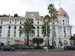 In 1912 Niermans created the Hotel Negresco on the Promenade des Anglais in Nice for the Romanian hotelier Henri Négresco. He designed it for the reception of royalty, as with other hôtels-palais on the Riviera. This was a time when the Riviera was at the height of its popularity as a resort for the wealthy or high-born, two years before the outbreak of World War I.[3] It was a rectangular building that occupied a full block of the Promenade des Anglais with four hundred rooms, each with a private bath. Two cupolas at the east and west corners were said to have been inspired by the breasts of La Belle Otero. The building had modern features like electric lights, elevators and telephones. A huge ballroom was roofed by a glass dome. Eight kings were present when the hotel opened in November 1912.[10]