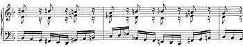 Chopin scholar Simon Finlow observes that a very similar passage occurs a decade before Chopin in the Rondo of Hummel’s Piano Concerto No. 2 Op. 85. In Hummel though the purpose of the semiquaver figure is to "decorate a chromatic sequence" whereas in Chopin the figure "embodies a motivic structure that permeates the entire composition" and reaches a "dramatic apotheosis" in the Coda.[9] Another remarkable trait is the upbeat character of the motif likewise permeating the entire piece. Like in the first two études of Op. 10 a rough copy autograph reads cut time (alla breve), further supported by the metronome mark MM 88 referring to half notes (rather than MM 176 referring to quarter notes).