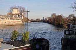 Île Saint-Germain is an island located in the Seine in Issy-les-Moulineaux in the département of Hauts-de-Seine near Paris, France. It once housed a military camp that was later abandoned, but the island was redeveloped in 1980. The island is divided into two parts. The developed side includes offices and a residential area. The other side includes a park that has been commemorated by the Tour aux Figures (Tower of Figures) painting by Jean Dubuffet. The Île Seguin is downstream.