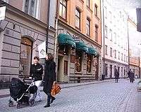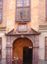 On either side of Number 37 are Lilla Hoparegränd ("Smaller Heaper's Alley", a corruption of "Hoper's Alley", e.g. hooper indicating a profession, 'maker of barrels') and Pelikansgränd ("Pelican's Alley"), both forking off from Gaffelgränd ("Fork alley"). While the building is standing on a medieval wall, the façade is from the 18th century, and the portal from the 17th century. The latter was probably cut by Johan Wendelstam, a German sculptor who arrived to Stockholm in 1641 to become the Guild Master within a few years, and also cut one of the portals on Stortorget. The client was apparently Dutch as the inscription on the gable stone reads: Gaet het wel men heeft veel vrinden kert het luck wie kan se vinden ("When luck stands by one have a lot of friends, but when luck turns where are they then?"). Behind the front door is an entrance hall featuring a richly profiled sandstone column carrying a cross-vault.[5][26] The façade of Number 24 dates back to 1862, the shutters and wooden panels from that time however replaced by the rough-cast plaster probably in 1945, and the windows enlarged since.[27] The rusticated façade of Number 26 dates back to the enlargement in 1846, at the time it was however perfectly symmetric, a balance manipulated in 1973 when the enlarged opening and wooden panel of the restaurant entrance was added. The northern door, still featuring some original details, gives a fair impression of what the façade looked like in the 19th century.[28] The façade of Number 28, arguably one of the oldest still existent residential properties in Stockholm, is mostly from 1874 with some details replaced in 1969.[29]
