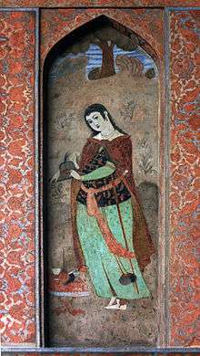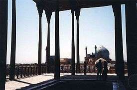 Ali Qapu (Persian: Āli Qāpu - عالی قاپو) is a grand palace in Isfahan, Iran. It is located on the western side of the Naqsh e Jahan Square, opposite to Sheikh Lotfollah Mosque, and had been originally designed as a vast portal. It is forty-eight meters high and there are six floors, each accessible by a difficult spiral staircase. In the sixth floor, Music Hall, deep circular niches are found in the walls, having not only aesthetic value, but also acoustic.