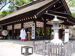 The main building, Ōtori zukuri, is built in one of the oldest architectural styles used for Japanese shrines.[4] This building burned down in 1905, but was rebuilt in 1909.