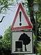Generic Warning symbol to which a Czech vandal added: "beware of low-flying witches".