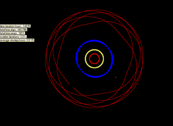 Simulations by Lykawka in 2007 show that (182294) 2001 KU76 is librating in the 11:6 resonance with Neptune.[2][3] This is the same resonance that dwarf planet Makemake is either near or in.[5] Both objects have a semi-major axis of 45 AU and an orbital period of about 302 years.