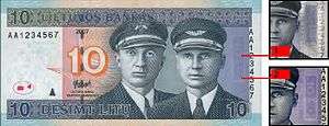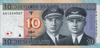 Like all Lithuanian banknotes, the ten litų note shows famous people on the obverse and famous places or buildings on the reverse. Front side of the note portrays two Lithuanian aviators Steponas Darius and Stasys Girėnas. They are famous for their Lituanica flight. In 1933 pilots flew from New York City over the Atlantic Ocean to Kaunas. After successfully flying 6,411 km, however, it crashed, due to undetermined circumstances, 650 km from its destination. Both of the aviators died. The reverse of the banknote shows Lituanica flying over the Atlantic Ocean.