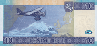 The note measures 135x65mm,[1] just like all banknotes in Lithuania. The ten litų banknotes show the flight of airplane Lituanica by Steponas Darius and Stasys Girėnas.