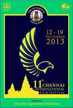 The Chennai International Film Festival (CIFF) was instituted in the year 2003 by the Indo Cine Appreciation Foundation (ICAF), a non-profit organisation.[1] ICAF is a registered film society and works for the promotion of meaningful cinema by organising country centric festivals throughout the year by obtaining films from Embassies and Consulates, and has around 500 members, including film directors, cinematographers and technicians.[2] In 2008, the Government of Tamil Nadu began supporting the event by sponsoring a part of it. The fest was reinvented in 2010 following the involvement of actor-director Suhasini which spiraled the direct involvement of film personalities in coordinating the fest. Later, when the funds raised through well-wishers were not substantial enough to support the event, the state government extended its support and financed the fest with a donation of ₹5 million (US$74,000). Since then, the government has been supporting the subsequent editions of the festival.[1] The fest is conducted every year during the month of December.[3]