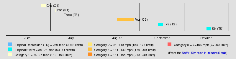Five of the six tropical cyclones affected land, including three making landfall with winds of over 74 mph (119 km/h). The first struck Texas as a hurricane, which caused moderate to heavy damage, particularly to shipping in Matagorda Bay. One death was indirectly related to the hurricane, as well as at least two injuries.[3]