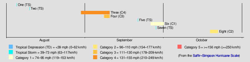 Of the season's eight tropical cyclones, four reached hurricane status. Furthermore, two of those four strengthened into major hurricanes, which are Category 3 or higher on the modern-day Saffir–Simpson hurricane wind scale. The strongest cyclone of the season, the third hurricane, peaked at Category 4 strength with 150 mph (240 km/h) winds. With a minimum barometric pressure of 924 mbar (27.3 inHg), it was the most intense tropical cyclone recorded in the Atlantic basin until the 1924 Cuba hurricane. The hurricane caused 40 fatalities after a brig went missing off the coast of North Carolina. Despite remaining offshore, Tropical Storm Five brought very strong winds to the Mexican city of Veracruz. Hurricane Eight brought strong winds and rough seas to North Florida and Georgia, causing significant damage in the latter.