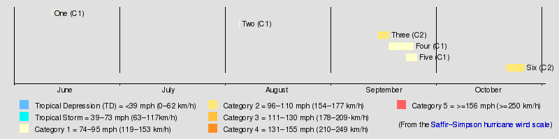 The season's activity was reflected with a low accumulated cyclone energy (ACE) rating of 45.[1] ACE is, broadly speaking, a measure of the power of the hurricane multiplied by the length of time it existed, so storms that last a long time, as well as particularly strong hurricanes, have high ACEs. It is only calculated for full advisories on tropical systems at or exceeding 39 mph (63 km/h), which is tropical storm intensity.[4]
