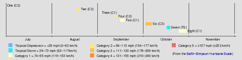 The season's activity was reflected with an accumulated cyclone energy (ACE) rating of 56.[1] ACE is, broadly speaking, a measure of the power of the hurricane multiplied by the length of time it existed, so storms that last a long time, as well as particularly strong hurricanes, have high ACEs. It is only calculated for full advisories on tropical systems at or exceeding 39 mph (63 km/h), which is tropical storm strength.[3]
