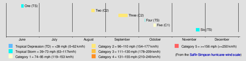 The first tropical cyclone was observed as a tropical storm offshore the East Coast of the United States from June 15 to June 17. The second and third systems were active in mid-August and mid-September, respectively, and both attained Category 2 intensity at their peaks on the modern-day Saffir-Simpson hurricane wind scale and neither made landfall. A fourth tropical cyclone caused flooding in Saint Lucia and brought heavy rain to parts of Barbados on October 5, but its track prior to that date is unknown. The fifth hurricane was known to be active for a few days in October off the East Coast of the United States. Finally, a sixth system was centered near Panama – between November 22 and November 25.
