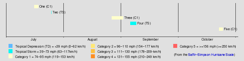 The season's activity was reflected with an accumulated cyclone energy (ACE) rating of 61.[4] ACE is, broadly speaking, a measure of the power of the hurricane multiplied by the length of time it existed, so storms that last a long time, as well as particularly strong hurricanes, have high ACEs. It is only calculated for full advisories on tropical systems at or exceeding 39 mph (63 km/h), which is tropical storm strength.[5]