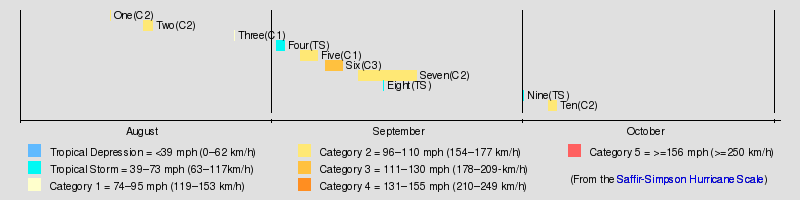 | Strongest storm1 | Six – 115 mph (185 km/h) (1-minute sustained) |