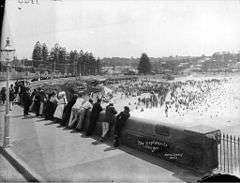 People generally agreed with strict regulations about dress but the idea of men wearing women's clothing was "going altogether too far", especially as male bathers were considered the "most manly of men" and sea-bathing both pleasurable and healthy.[12] The "skirt" ordinance and the consequent demonstrations culminated decades of protest from conservative beach goers who decried the 'exhibitionism' of scantily clad surf bathers. However, the demonstration against the proposal by three Sydney mayors to introduce skirted bathing costumes on Sydney's main beaches showed the resistance particularly of middle class men who were members of the newly established Surf Bathers Association of New South Wales.[13]