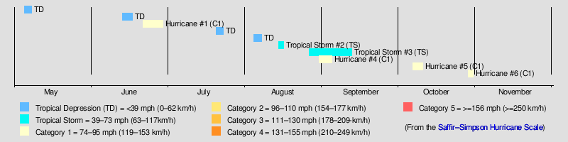 Of the season's ten tropical cyclones, six became tropical storms and four strengthened into hurricanes. Furthermore, none of these strengthened into a major hurricane—Category 3 or higher on the modern-day Saffir–Simpson hurricane wind scale—marking the sixth such occurrence since 1900.[2] The strongest hurricane of the season peaked as only a Category 1 with winds of 85 mph (140 km/h). That system left five deaths and at least $4 million in damage in North Carolina. The first hurricane of the season also caused one fatality in Texas, while damage in South Carolina from the fifth hurricane reached at least $75,000.