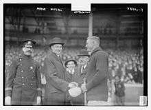 Opening day was April 14, 1915, at the Polo Grounds against the Brooklyn Dodgers with 20,000 attendees. Mayor John Purroy Mitchel threw the ceremonial first pitch. The New York Giants Opening Day starting pitcher was Jeff Tesreau. The Giants won 16 to 3.[1]