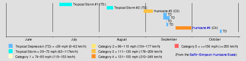 The season's activity can be quantified in an accumulated cyclone energy (ACE) rating of 61.[2] ACE is, broadly speaking, a measure of the power of the hurricane multiplied by the length of time it existed; therefore, storms that last a long time, as well as particularly strong hurricanes, have high ACE ratings.[3]