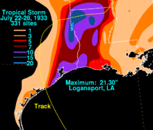 - 1 2 3 R.A. Dyke (July 1933). "Excessive Rainfall of July 22–25, 1933, in Louisiana and Extreme Eastern Texas" (PDF). Monthly Weather Review. National Oceanic and Atmospheric Administration. 61: 202–203. Bibcode:1933MWRv...61..202D. doi:10.1175/1520-0493(1933)61<202:erojil>2.0.co;2. Retrieved 2012-06-16.