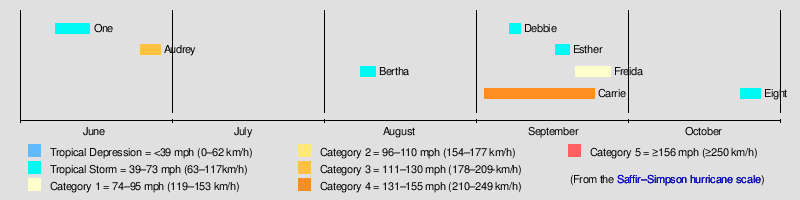 The Atlantic hurricane season officially began on June 15, 1957.[4] It was a below-average season in which eight tropical cyclones formed, of which three became hurricanes.[5] Of these hurricanes, two became major hurricanes.[6] In an average season, ten tropical cyclones form, of which five become hurricanes.[5] Five of the season's eight tropical cyclones developed in the Gulf of Mexico, the most since the 1936 season, in which six formed in the gulf.[7] The first tropical storm of the season formed on June 8, a week before the official start of the hurricane season. However, the first named storm, Audrey, formed afterwards, on June 25; these two storms were the only to form in June during the season. July featured no Atlantic tropical cyclones. Tropical Storm Bertha was the only system to form during August, developing in the Gulf of Mexico.[6] Despite warm sea surface temperatures (SSTs) in the tropical Atlantic, no storms formed during the month, below the climatological average of one.[8] The low monthly activity was in part due to an unfavorable wind pattern which prevailed across the Atlantic for much of the month. In September, however, conditions for tropical cyclogenesis were more favorable, with concomitant cyclonic activity. Four storms formed, of which two attained hurricane strength, higher than the mean activity of the last 70 Septembers.[7] By contrast, only one tropical storm formed in October, below the average of two in the month.[9] This tropical storm dissipated on October 27, 16 days before the official end of the hurricane season.[6]