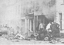 On 12 June 1973, two cars stolen from south County Londonderry were packed with explosives and driven by an Active Service Unit (ASU) of the South Derry Provisional IRA to the mainly-Protestant town of Coleraine. The carbombs were parked on Railway Road and Hanover Place. Two warnings made to the Telephone Exchange at 2.30 p.m. named the location for the Hanover Place device and for another bomb on Society Street, which later "proved to be a hoax". At about 3.00 p.m. a Ford Cortina containing a 100–150 pound (45–68 kg) bomb exploded outside a wine shop on Railway Road, killing six pensioners (four women and two men) and injuring 33 people, a number of them schoolchildren.[1] The six pensioners—Elizabeth Craigmile (76), Robert Scott (72), Dinah Campbell (72), Francis Campbell (70), Nan Davis (60), and Elizabeth Palmer (60)—were all Protestant. Elizabeth Craigmile, the Campbells and their daughter Hilary had been on a day outing and were returning home to Belfast when the bomb had gone off; they were beside the carbomb at the moment of detonation. Some of the dead had been blown to bits and Hilary Campbell lost a limb.[2][3][4] Several of the wounded were maimed and left crippled for life.[5] The bomb left a deep crater in the road and the wine shop was engulfed in flames; it also caused considerable damage to vehicles and other buildings in the vicinity. Railway Road was a scene of carnage and devastation with the mangled wreckage of the Ford Cortina resting in the middle of the street, the bodies of the dead and injured lying in pools of blood amongst the fallen masonry and roof slates, and shards of glass from blown-out windows blanketing the ground. Rescue workers who arrived at the scene spoke of "utter confusion" with many people "wandering around in a state of severe shock".[6] Five minutues later, the second bomb went off in the forecourt of Stuart's Garage in Hanover Place. Although this explosion caused no injuries, it added to the panic and confusion yielded by the first bomb.[1]