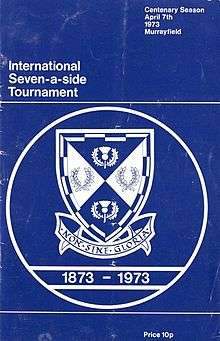 The 1973 International Seven-A-Side tournament was the first Rugby Sevens tournament to feature national representative teams,[1] predating the first official Rugby World Cup Sevens by twenty years. Held in Scotland as part of the Scottish Rugby Union's centenary celebrations, the tournament featured players from all eight of the members of the IRB. Although not sanctioned by the IRB as an official world cup the winners, England, were hailed by the press as the world seven-aside champions.[2]
