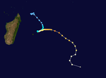 Angele form on December 13, while stationed in the middle of the Mozambique Channel. It traveled north and gradually organized into a tropical storm while performing a tight counter-clockwise loop. On December 18 Angele intensified into a tropical cyclone before making landfall on Mozambique. Angele weakened to a tropical storm while over land, but re-intensified back to a tropical cyclone as it re-emerged into the Mozambique channel. The cyclone moved south and quite abruptly, on December 23, moved to the northeast. On December 24 Angele reached a peak intensity as a category three cyclone. The system weakened slightly before making landfall on Madagascar two days later. The weak storm moved over the open Indian Ocean and translated into an extra-tropical storm.