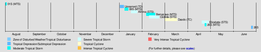 In addition to the storms classified by the MFR, the JTWC tracked four additional storms. The first, classified as Tropical Cyclone 01S, formed on August 1 in the northeastern portion of the basin,[2] an infrequent event for the time of year.[7] The storm moved westward with peak 1 minute winds of 85 km/h (50 mph). It gradually weakened, dissipating on August 3 near Diego Garcia.[8] The JTWC also tracked a short-lived storm in January that they classified as Tropical Cyclone 06S. The storm formed on January 7 in the eastern portion of the basin near Diego Garcia, and reached winds of 85 km/h (50 mph) while moving southeastward. After stalling on January 9, the system dissipated three days later.[2][9] Later, the agency monitored Tropical Cyclone 26S beginning on April 24. The storm formed south of Diego Garcia and moved in a counterclockwise direction, first to the southeast and later to the north. After reaching peak 1 minute winds of 85 km/h (50 mph), the storm dissipated on April 26.[2] The final storm tracked by the agency originated on June 25 in the far northeastern portion of the basin between Diego Garcia and the Cocos Islands. It moved slowly to the southwest, failing to intensify beyond winds of 65 km/h (40 mph). Turning to the southeast, the system dissipated on June 27.[2]
