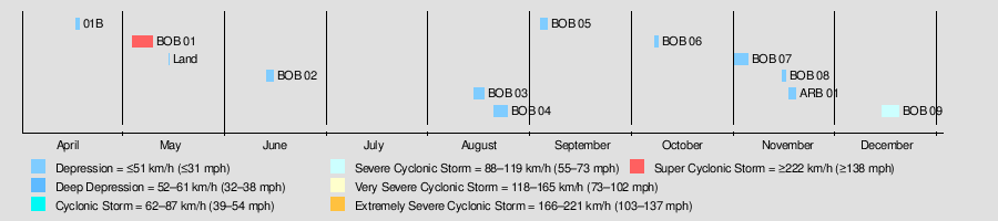 | Strongest storm1 | BOB 01 – 920 hPa (mbar), 235 km/h (145 mph) (3-minute sustained) |