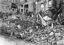 The battalion subsequently served on the Western Front until the end of the war in late 1918.[1] After the battalion's introduction to trench warfare around Fleurbaix it was committed to the Battle of Pozieres in July 1916 where, under the command of Lieutenant Colonel Edmund Nicholson – an artillery officer who had served at Gallipoli – they laid the form-up trench for the attack, before being committed to the capture of the village itself.[7][8] The battalion's losses in its first battle amounted to 180 killed or wounded.[9] During the next two-and-a-half years, the battalion fought in most of the main battles that the Australians fought in along the Western Front. They took part in the Battle of Mouquet Farm later in 1916, and in early 1917, they were tasked with extending a light railway system towards Fremicourt as part of preparations for the Battle of Bullecourt.[10] Later in the year, they took part in the Third Battle of Ypres, taking part in actions around the Menin Road, Polygon Wood, Broodseinde Ridge and Passchendaele.[11] Later, around Ypres in October, the battalion worked to clear the Ypres–Zonnebeke road, which had virtually disappeared under a layer of thick mud and debris due to a prolonged artillery bombardment.[12]