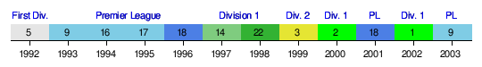 Prior to this season, the history of Manchester City's performance in the English football league hierarchy since the creation of the Premier League in 1992 is summarised by the following timeline chart – which commences with the last season (1991–92) of the old Football League First Division (from which the Premier League was formed).