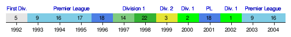 Prior to this season, the history of Manchester City's performance in the English football league hierarchy since the creation of the Premier League in 1992 is summarised by the following timeline chart – which commences with the last season (1991–92) of the old Football League First Division (from which the Premier League was formed).
