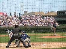 .JPG) Chris Young pitching against the Cubs at Wrigley Field on June 16; he was working on a no-hitter but was later ejected from the game after he and Derrek Lee got into a fight that turned into a bench-clearing altercation.