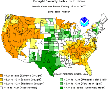 Much of eastern North America experienced more average conditions through July 2007, with little in the way of prolonged heat waves. However, drought remained a problem in some areas of the east, particularly parts of the southeast.