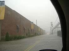 The National Weather Service in Louisville was struck by lightning at about 9:20 am EST, halting all operations at the location. The local emergency broadcast tower was also hit, briefly stopping all emergency communication in the city. The WDRB television news studio had water rise into the building during its newscast, prompting a makeshift water barrier to be erected during the broadcast.[3] At about 10:40 am EST, the National Weather Service extended the Flood Warning for city until 1 pm EST and a Thunderstorm Warning until 4 pm EST due to new and heavy bands of thunderstorms entering the area. Lightning stuck an apartment complex in the Hurstborne neighborhood, starting a fire that consumed most of the sixteen unit building. A second apartment in the west-end of Louisville was struck by lightning and destroyed by the fire caused by the strike.[4]
