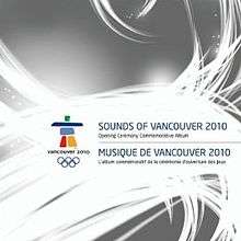 A soundtrack, Sounds of Vancouver 2010: Opening Ceremony Commemorative Album (French: Musique de Vancouver 2010 : L'album commémoratif de la cérémonie d'ouverture des Jeux), was released through the iTunes Store on February 12, 2010, containing many studio recordings of the performances from the opening ceremony.[63] It charted at #6 on the Canadian Albums Chart, and has sold over 50,000 copies.[64] The song performed by Garou, "Un peu plus haut, un peu plus loin", was released on the accompanying soundtrack for the closing ceremony.