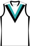 The black jersey, also known as the "Back in Black" jersey is used as the home kit and is the predominant Guernsey used by the team, including away matches if the two teams colours don't clash. If they do, the white kit is introduced, used as the away kit. The same design applies for both, with the two coloured "V" symbol used. On the white kit, it features black and teal, with the home kit featuring white and teal