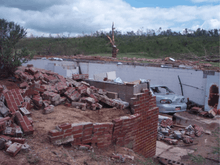 Soon after crossing into Franklin County, the town of Phil Campbell experienced significant devastation of the same magnitude as Hackleburg. Numerous homes, some of which were well-constructed, were swept away as the tornado tore through town. At least three churches along the path sustained significant damage, with one church in the town being completely destroyed and having only the foundation slab remaining. Multiple mobile homes throughout the path were completely destroyed, and their mangled frames were tossed at least 25 to 50 yards (23 to 46 m). Cars were tossed and destroyed throughout the path of the tornado, with one car wrapped around a debarked tree. A 25-foot (7.6 m) section of pavement was torn from a road in this area as well. The most intense damage along the path occurred northeast of Phil Campbell in the rural community of Oak Grove, where vehicles were carried long distances and mangled beyond recognition, large trees were completely debarked, and large brick homes with extensive anchoring were obliterated with the debris wind-rowed hundreds of yards away. The tornado continued into Lawrence County, impacting the Mount Hope community, where significant devastation was incurred to single-family homes and a restaurant. Nothing but the foundation and a pile of debris remained at the restaurant site, and a small portion of the restaurant's foundation slab buckled.[89]