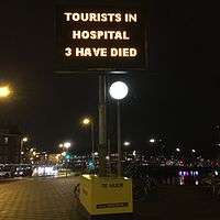 On 25 November 2014 two British tourists aged 20 and 21 died in a hotel room in Amsterdam, the Netherlands, after snorting white heroin that was sold as cocaine by a street dealer.[1] The bodies were found less than a month after another British tourist died in similar circumstances. At least 17 other people have had medical treatment after taking the white heroin.[2] Health authorities in Amsterdam are warning of the dangerous drugs being sold. Large signs were set up at popular tourist locations in the city.[3] An award of €15,000 is offered for tips about the dealer of the drugs.[4] On 20 January 2015 the last warning signs were removed from the city as there had been no further incidents.[5]
