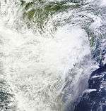 In late October, a low pressure area formed over the Arabian Sea. It slowly consolidated and a Tropical Cyclone Formation Alert (TCFA) was issued by the Joint Typhoon Warning Center (JTWC) on October 24.[27] The following day, the India Meteorological Department (IMD) classified the storm as a depression, designating it ARB 02, and the JTWC estimated tropical storm winds at the storm's center, starting advisories for the system.[28] On October 26, the system remained stationary and intensified into a Deep Depression. Subsequently, the IMD reported the storm had intensified into a cyclonic storm, and named it Nilofar.[29][30] The following day, the IMD upgraded the storm into a severe cyclonic storm and further to a very severe cyclonic storm, and the JTWC reported hurricane-strength winds at Nilofar's center as it meanwhile developed an eye feature.[31][32][33] On October 28, Nilofar underwent rapid deepening throughout the day, reaching a peak strength of 950 mbar (28.05 inHg) with wind speeds exceeding 205 km/h (127 mph), tied with Hudhud. Over the following days, the storm recurved northeastwards and experienced high vertical wind shear, causing it to weaken rapidly into a minimal cyclonic storm on October 30. The low-level circulation center of the storm became exposed in the following hours and IMD downgraded the storm into a well-marked low pressure area on October 31, issuing its final advisory for the system.