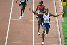 Haile Gebrselassie, Kenenisa Bekele and on the women's side Tirunesh Dibaba had all done it before, Mo Farah had the opportunity to be the first non-Ethiopian runner to defend a world 10,000 metres championship. The Kenyan triumvirate of Geoffrey Kipsang Kamworor, Paul Kipngetich Tanui and Bedan Karoki Muchiri took the race out, multiple 64 second laps breaking the race apart to the point that there were only two remaining stragglers, Farah and his American training partner Galen Rupp. Farah, Rupp and Tanui were all returning from top 5 finishes two years earlier. As the pace dropped, Farah briefly showed his intent to win with 3200, 1500 and 1200 to go, but each time Farah poked into the lead the Kenyan team quickly scrambled to retake the lead. Then with 500 metres to go to the finish, Farah boldly launched his long assault for the finish.[3] In championship races, long sprints to the finish usually lead to defeat as the more sprint inclined racers are able to run down the breakaway near the finish, but Farah held the lead as the three, then two Kenyan rivals jockeyed for position to catch him. In the final turn as he was maneuvering through traffic, Kipsang got close enough to clip Farah's heels, with Farah stumbling and almost falling.[4] Farah stayed on his feet with Kipsang close behind, then Tanui managed to pull even with Kipsang through the final turn. Coming into the final straight, World Cross Country champion Kipsang looked like he would be able to swing around Farah to victory, but a determined Farah instead accelerated pulling away to a clear win, celebrating as he crossed the finish line. Farah's final lap time was 54.15. For the second time in a row, Tanui found himself in bronze medal position.[5]