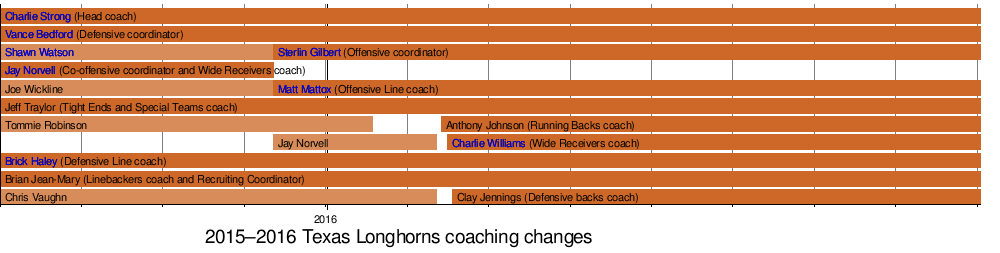 Concurrent with Texas' search for a new offensive coordinator, Missouri reportedly showed interest in Texas special teams and tight end coach Jeff Traylor. On December 16, Traylor was offered and accepted a pay raise from the Longhorns, suggesting that Traylor's scheduled interview with the Missouri Tigers was eventually cancelled.[9] Traylor later interviewed for the vacant head coach position at Texas State in January 2016, though Texas State would eventually hire Everett Withers as head coach.[10] Traylor's son, Jordan Traylor, became a graduate assistant for the Longhorns on January 8 after finishing his collegiate football career at Texas A&M.[11] On January 18, Texas running backs coach Tommie Robinson announced his departure from Austin to join the University of Southern California (USC) coaching staff for the same position, meaning that none of initial offensive staff hires made by Charlie Strong at the beginning of his first year at Texas will be set to coach the Longhorns in 2016.[12] On February 11, Texas defensive backs coach Chris Vaughn was dismissed from the team after he was implicated in an ongoing NCAA investigation of the Ole Miss Rebels football team.[13] The same day, wide receivers coach Jay Norvell left the University of Texas to coach at the same position at Arizona State, resulting in a total of three significant coaching vacancies at Texas by mid-February.[14]