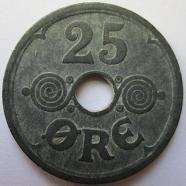 The 25 øre coin was minted between 1941 and 1945 during the German occupation of Denmark. They were made entirely of zinc, which was a cheap metal commonly used in the German-held territories for occupation currency.