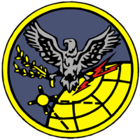 On a blue disc. Issuing from lower left a yellow demisphere grid lined black and a yellow satellite in lower left emitting two red dash lines to the sphere; above the sphere and satellite a gray eagle with wings displayed throughout detailed black olive branches with white berries in his left claw; all within a narrow yellow border.