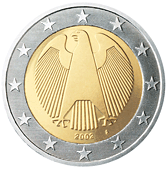 | The German design depicts the German coat of arms (the German eagle) which symbolises German sovereignty. The date appears at the base of the eagle and the gold behind the stars is etched to give visual effect. It was designed by Heinz and Sneschana Russewa-Hoyer. |