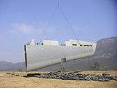 While standing on the property, Hertz imagined a floating roof that would hang over the site to minimize structural obstructions of the views of a nearby mountain ridge. Hertz's initial concept sketches showed a site section with a curved ceiling and a roof form that reminded him of the wing section of an airplane. The wing, a self-supporting structure, cantilevers off the fuselage of an airplane like an outstretched arm. This requires little vertical support and only a few walls, which is ideal for a structure to minimize obstructions and maximize views.[3] Creating a wing foil shaped roof would be complex and difficult to build conventionally.[3] Through examining and exploring a variety of actual wing dimensions, Hertz determined that the wings from a 747 would fit on the existing pads and that they were already oriented to keep the views. The low profile of the wings was integrated into the ridge top, and the wing made to appear to cascade down and float above the ground. Utilizing the wings as 100% post-consumer recycled components and appropriating them in creative new ways is consistent with the existing context of Duquette’s structures of found objects and emblematic of Hertz's thoughts on the "disposable" nature of our society.[4]
