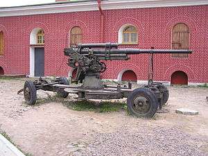 76 mm air defense gun M1938 (Russian: 76-мм зенитная пушка обр. 1938 г.) was 76.2 mm (3 inch) Soviet air defense gun, created by Soviet artillery designer M.N.Loginov. This gun was a modernized version of the 76.2 mm air defense gun model 1931, with a slightly modernized barrel and a completely new two-axle carriage ZU-8. This carriage was also used for the more powerful 85 mm 52-K air defense gun, developed in 1939.