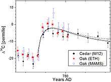 . Bibcode:2013A&A...552L...3U. doi:10.1051/0004-6361/201321080. - ↑ Jull, A.J.T.; Panyushkina, I.P.; Lange, T.E.; et al. (2014). "Excursions in the 14C record at AD 774-775 in tree rings from Russia and America". Geophys. Res. Lett. 41: 3004–3010. Bibcode:2014GeoRL..41.3004J. doi:10.1002/2014GL059874.