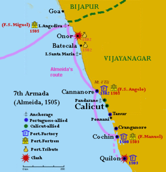 Manuel I designated D. Francisco de Almeida as captain-major of the 7th Armada, with the obligation to remain in India for three years. He would only be allowed to assume the title of 'Vice-Roy' upon the construction of four crown fortresses in India at Anjediva, Cannanore, Cochin and Quilon.[4]