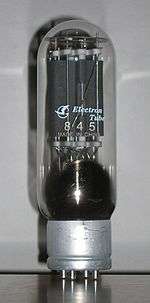 The 845 power triode is a radio transmitting vacuum tube which can also be used as an audio amplifier and modulation tube. Typically, the plate is machined from solid graphite in order to accommodate high current dissipation (up to 100 watts) and voltage. Some current production 845 tubes have metal plates.